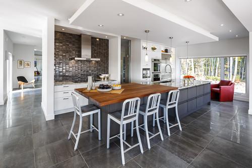 Natural stone or porcelain tile is another classy and beautiful flooring for kitchens. Tiles are a popular choice in the Los Angeles area, where their cool feeling is a bonus. Porcelain tiles can range in appearance from high gloss modern to rustic old world. Stone or tile floors in your kitchen will enhance the value of your home. They are highly durable and require little maintenance. Porcelain tiles are very resistant to water, which can make them a great choice for kitchens and bathrooms. One downside to natural stone or porcelain flooring is their relative hardness. They can be tiring to stand on for long periods of time, and dishes dropped on this floor are more likely to shatter.